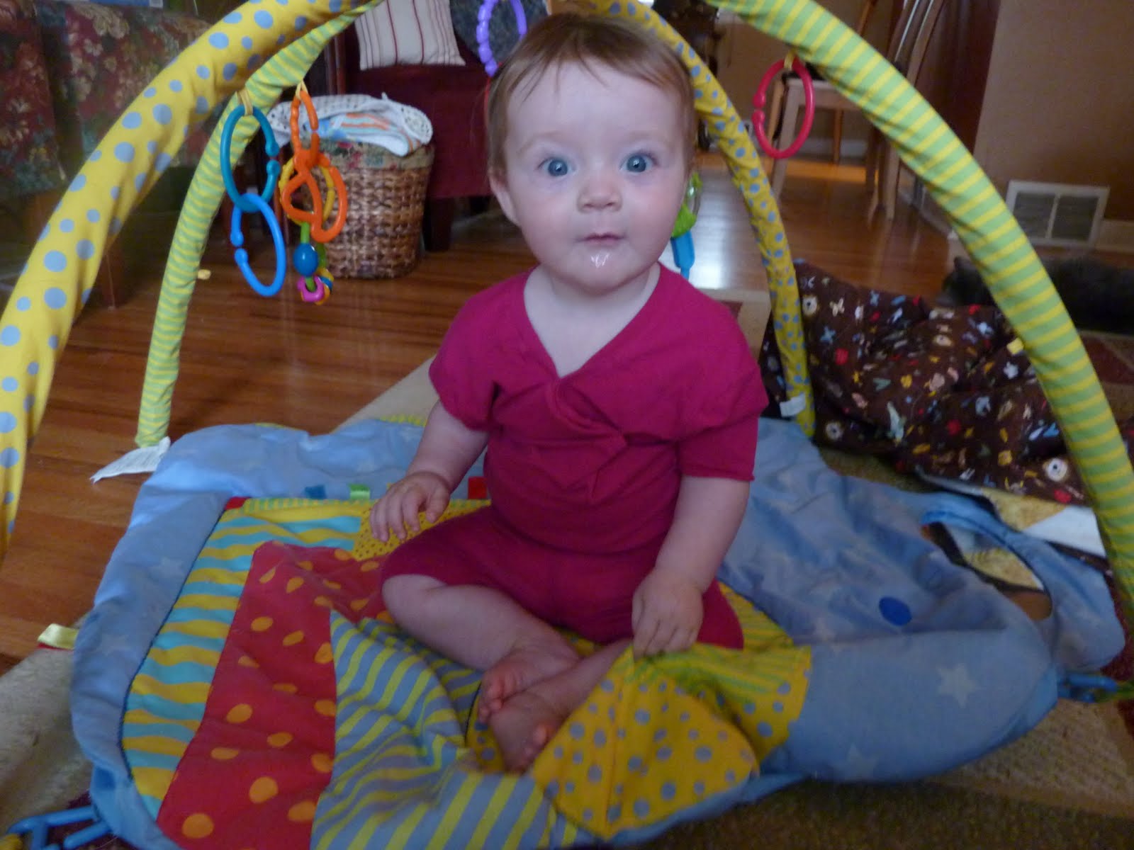 Another project, currently in progress: Our friend Kate* made this terrific quilt for Blueberry. She gave it to us before Blueberry was born, and I had been "protecting" it by not using it. It was carefully draped over the back of the crib. It looked lovely. Then one day, Kate came over to share her knowledge of quiltmaking and to help me with the logistics of a big new project which we shall call The Norway Quilt and which shall be blogged about in a later post. OOOH suspense!! I'm a regular Steven King. In the course of things I brought the quilt she had made down from the nursery and she made me feel better about actually using it. And since then, Blueberry has thoroughly enjoyed looking at it and playing on it.